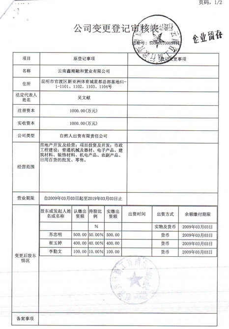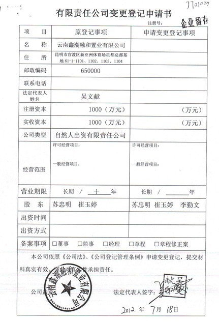 據(jù)崔玉婷助手李波出具的一份“公司變更登記審核表”。審核表顯示的登記日期是2009年3月3日,由蘇忠明出資500萬元,持有云南鑫潮融合置業(yè)有限公司50%股份,另外崔玉婷出資400萬元,持有公司40%股份,還有一個(gè)叫李勤文的股東出資100萬元,持有公司10%的股份。同時(shí)李波還出具了一份“有限責(zé)任公司變更登記申請(qǐng)書”在2012年7月18日時(shí),落有云南鑫潮融合置業(yè)有限公司印章的一份“有限責(zé)任公司變更登記申請(qǐng)書”上記錄,公司法人代表為吳文獻(xiàn),申請(qǐng)變更登記事項(xiàng)股東一欄載明,股東蘇忠明、崔玉婷、李勤文。原登記事項(xiàng)股東一欄只有蘇忠明和崔玉婷的名字,李勤文的名字已經(jīng)不在股東姓名一欄。至于申請(qǐng)變更最后是否獲最終確認(rèn),就不得而知。