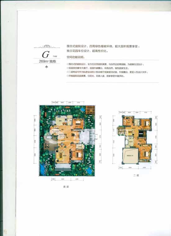 獨(dú)棟G戶型,面積269平米,主要分布在B8—B26棟,這個戶型共有兩層。該戶型的特點(diǎn)是:采用了圍合式的庭院設(shè)計(jì),四周被綠色的植被所環(huán)繞,業(yè)主可以全方位地欣賞庭院美景;客廳采用了雙層挑高設(shè)計(jì);再加上獨(dú)立的花園車位設(shè)計(jì),性價比較高。