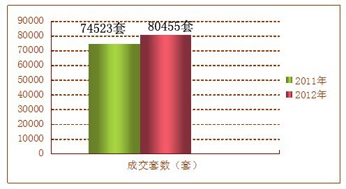 根據(jù)昆明市房產(chǎn)信息網(wǎng)統(tǒng)計(jì)數(shù)據(jù)顯示,從2012年01月01日至2012年12月31日,一年內(nèi)昆明主城區(qū)及呈貢新城共成交各類商品房80455套,較2011年的74523套增加了5932套,同比上漲了8.0%;成交面積方面,2012年昆明樓市成交商品房總面積為6939931.5㎡,較2011年的6055703.4㎡增加了884228.1㎡,同比上漲了14.6%。