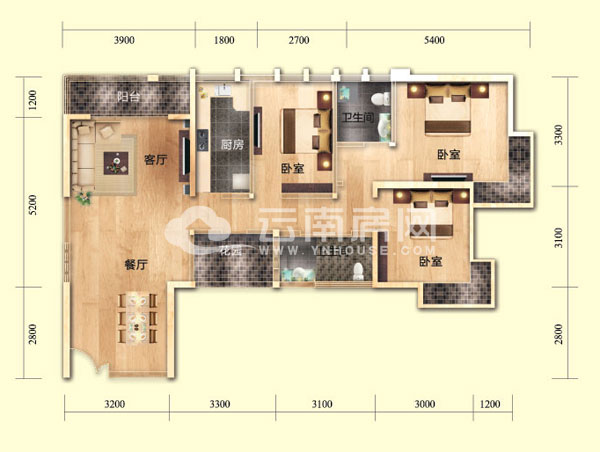 B3戶型同樣為三室兩廳一廚兩衛(wèi)兩陽(yáng)臺(tái),建筑面積為116.15平米,從平面圖上看,B3戶型最大的亮點(diǎn)便是一個(gè)8平米的陽(yáng)臺(tái),只要在裝修時(shí)好好設(shè)計(jì),陽(yáng)臺(tái)空間將會(huì)發(fā)揮意想不到的作用,或放置一張咖啡桌,或做成玻璃花房,這個(gè)8平米的空間將在業(yè)主的自主能動(dòng)性中變得美輪美奐。該戶型的動(dòng)靜區(qū)分明,戶型的左邊為日;顒(dòng)區(qū),而右側(cè)則為休息區(qū),同時(shí),明廚明衛(wèi)、布局緊湊也是該戶型的優(yōu)點(diǎn)。