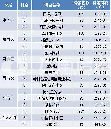 本周各區(qū)域房地產(chǎn)市場交易套數(shù)三強:本周備案前三強分別位于呈貢、東市區(qū)和中心區(qū),排名先后順序為:風(fēng)華俊園、溪畔麗景小區(qū)與同德廣場III。 注:由于備案系統(tǒng)未公布成交金額,故備案金額暫時空白。