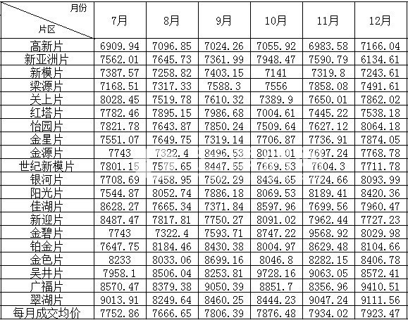 金星片2012年1月的成交均價為9260.38元/平米,2、3、4、5月的均價均是“7”字頭,6月均價漲至8084.04元/平米,7月又下跌至7551.07元/平米,其余的月份均價在7600——7900元/平米之間。