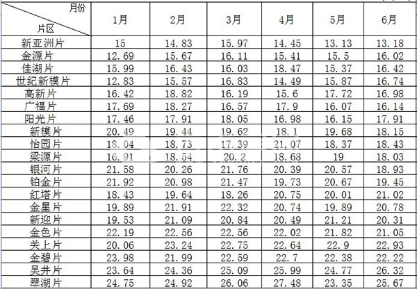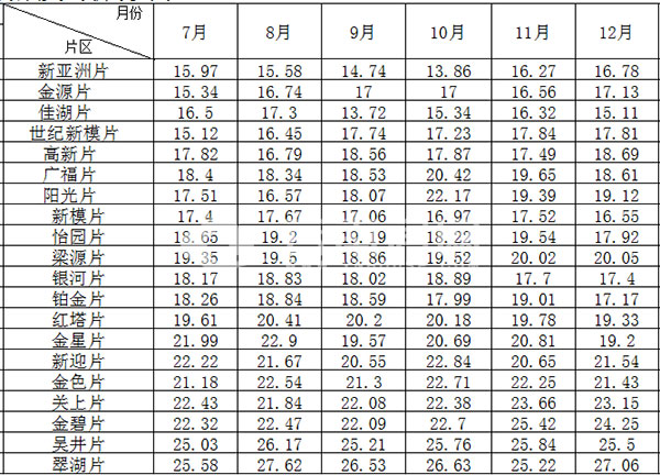 廣福片、陽光片、新模片、怡園片、梁源片、銀河片、鉑金片等8個片區(qū)中,除了少部分的均價在16——18元/平米以外,大部分片區(qū)單月的租金均在18元/平米以上。均價最低的是廣福片5月的租金,為16.07元/平米,其次是6月,租金為16.14元/平米,新模片12月16.55元/平米的租金排名第三,廣福片3月、陽光片8月16.57元/平米的租金一樣,均排在第四,梁源片2012年1月16.91元/平米的租金排名第五,余下的各個片區(qū)單月的租金在17——18元/平米。