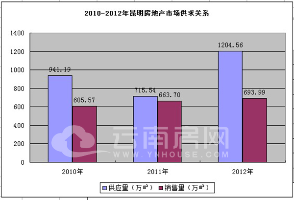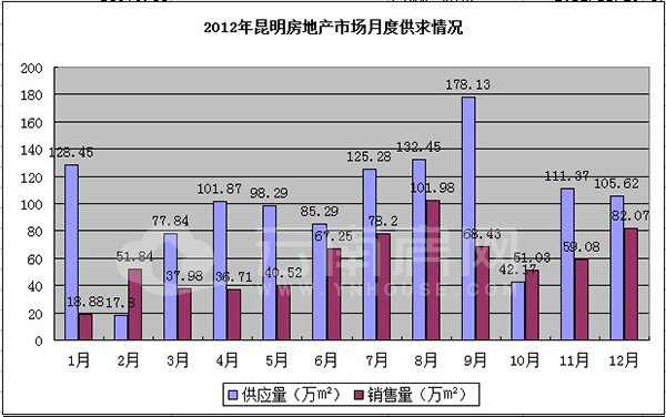 從2012年供求關(guān)系可以看出,2012年除了2月份和10月份供不應(yīng)求外,其余10個月均供過于求。2012年預(yù)售面積為1204.56萬㎡,成交面積為693.99萬㎡,供求比為1.7,整個2012年昆明房地產(chǎn)市場供過于求。