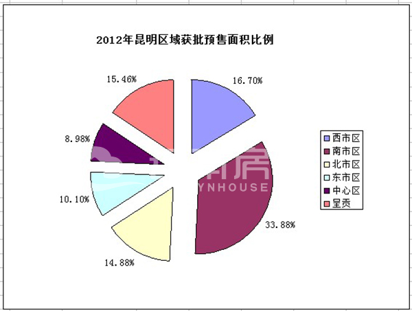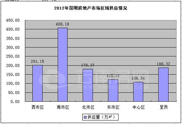 而從區(qū)域供給來看,2012年昆明樓市商品房主要供應仍集中在南市區(qū),其預售量達408.18萬平方米,占總預售面積的33.88%,中心區(qū)最少,僅占8.98%。