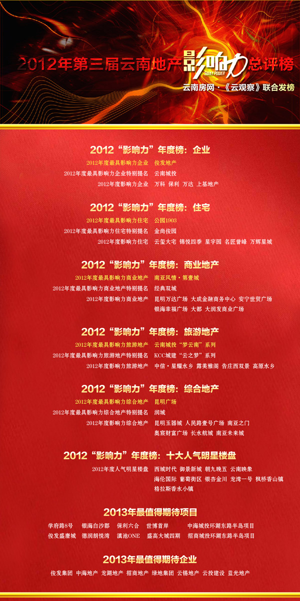 2012年第三屆云南地產(chǎn)“影響力”總評(píng)榜——綜合地產(chǎn)篇