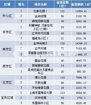 本周備案前三強(qiáng)分別位于中心區(qū)、南市區(qū)與呈貢,排名先后順序?yàn)椋罕碧┗▓@I、金坤尚城II和上海東盟商務(wù)大廈。注:由于備案系統(tǒng)未公布成交金額,故備案金額暫時空白。