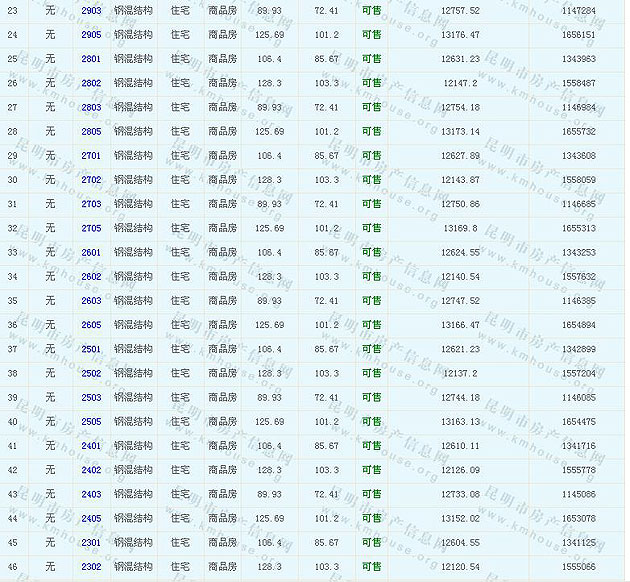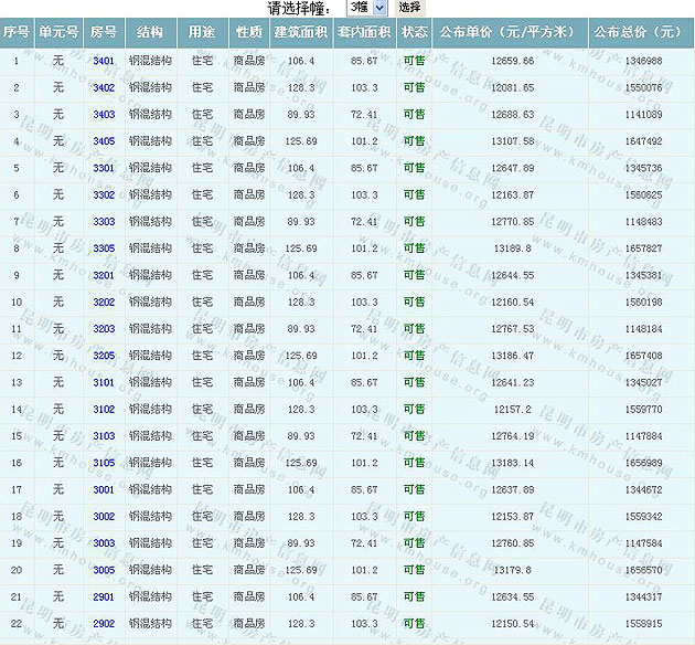 根據(jù)云南省物價(jià)局關(guān)于發(fā)布《云南省商品房銷售明碼標(biāo)價(jià)實(shí)施細(xì)則(試行)》的通知,現(xiàn)將該項(xiàng)目商品住房的準(zhǔn)售房源及每套房屋價(jià)格向社會(huì)公布,房地產(chǎn)開發(fā)企業(yè)應(yīng)嚴(yán)格按照公布價(jià)格,商品房銷售明碼標(biāo)價(jià)實(shí)行一套一標(biāo)。商品房經(jīng)營(yíng)者應(yīng)當(dāng)對(duì)每套商品房按照建筑面具進(jìn)行明碼標(biāo)價(jià),否則,房產(chǎn)登記機(jī)關(guān)不予登記備案。準(zhǔn)售房源及房?jī)r(jià)信息如下: