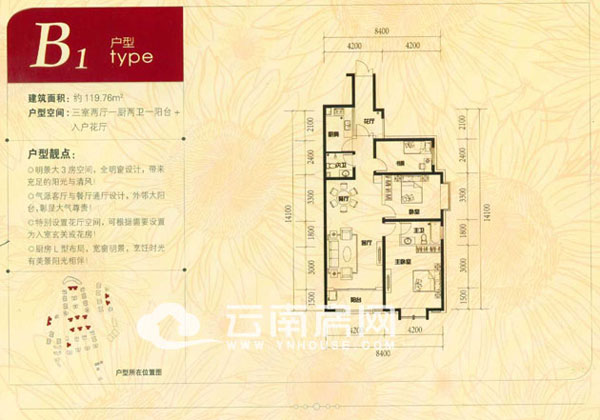 小編推薦戶型一為119.76平米的B1戶型,三室兩廳一廚兩衛(wèi)生一陽臺加入戶花廳,該戶型適合三口或四口之家居住。從戶型圖上看該戶型最大的亮點有一個入戶花廳,試想一下,每天下班回到家,進(jìn)門就看到的不是布局死板的客廳,而是一個有鮮花點綴的花廳,花香四溢,豈不美哉。其次是主臥配有浴室,讓主人的生活起居更為方便。廚房是L型布局,寬窗明景,讓女主人在烹飪的時候還可以觀賞窗外的綠化美景,做飯的心情是不是會大好呢。且廚房布局在一進(jìn)門的右側(cè),與主臥室、次臥以及書房分立兩側(cè),這樣可減少油煙味的侵襲。