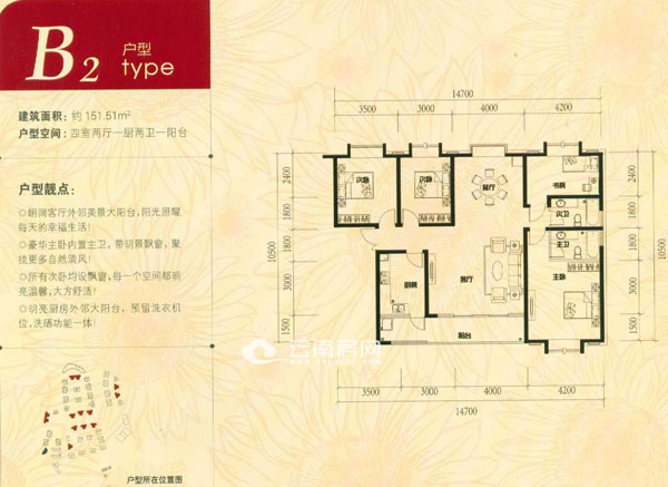 小編推薦戶型二位151.51平米的B2戶型,四室兩廳一廚兩衛(wèi)一陽臺,該戶型適合有老人和孩子的家庭居住,可營造其樂融融的居住氛圍。戶型亮點為所有主次臥均設(shè)有飄窗,每一個空間都明亮溫馨,大方舒適?蛷d寬敞大氣且與陽臺相鄰,可在陽臺上布置美景,坐于客廳與友人聊天時還可觀賞美景陽臺,可盡享幸福時光;明亮廚房也與大陽臺相鄰,且陽臺上預(yù)留有洗衣機位,可洗曬功能一體。