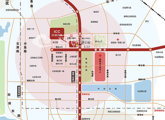 吳家營片區(qū)是呈貢新城的中心片區(qū),是新城的行政中心和商業(yè)商務中心。ICC環(huán)球廣場項目就坐落于昆洛路和春融街交叉口以北200米位置,緊鄰呈貢區(qū)政府,離市級行政中心300米,距大學城僅6公里,是連接昆明新老城區(qū)、去往市政府的必經之路。項目的北、東、南三個方向環(huán)繞有洛龍公園、春融公園、春城公園、中央公園等四大城市公園,大大提升了項目的人居價值和形象。東側昆洛路下方為規(guī)劃建設中的昆明地鐵,地鐵一號線直接接入地下商業(yè),具有絕對的商業(yè)區(qū)位優(yōu)勢。ICC環(huán)球廣場的建成有望成為呈貢新區(qū)的又一商業(yè)地標,它也將為呈貢新區(qū)的城市發(fā)展和商業(yè)配套注入更多的新元素和新動力。