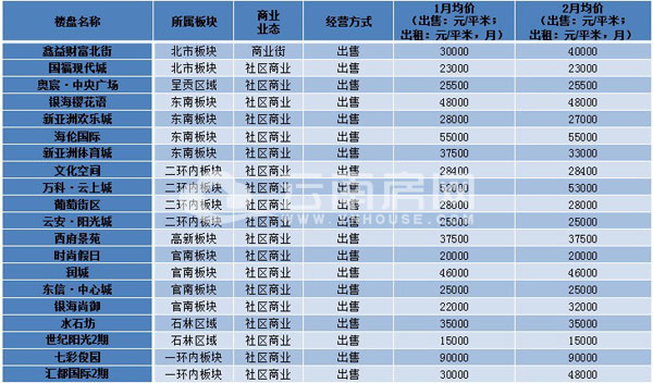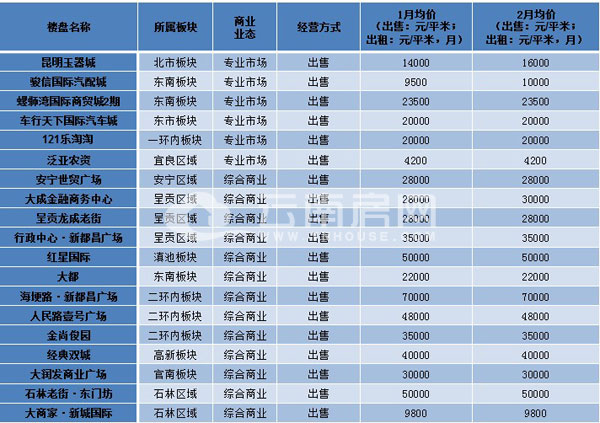 從1、2月商業(yè)銷售均價變化情況來看,鑫益財富北街、銀海尚御、匯都國際、昆明玉器城等項目商鋪銷售價格上漲幅度較快,市場價格漲幅總體平穩(wěn)上漲。