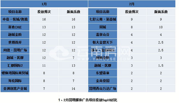 2月份昆明媒體廣告各板塊項目投放數(shù)量相當,其中呈貢區(qū)域的七彩云南·第壹城和官南板塊的潤城項目投放頻次最多,分別投放9次和8次。