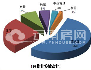 1月份物業(yè)投放較為豐富,且以綜合體物業(yè)投放最強,主要集中東南板塊和二環(huán)內(nèi)板塊;住宅物業(yè)投放主要集中于滇池板塊;專業(yè)市場僅于呈貢區(qū)域投放。