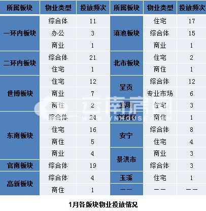 綜合體主導(dǎo):1月各物業(yè)投放情況以綜合體物業(yè)最強(qiáng),占整體投放比例的56%,主要集中于東南板塊和二環(huán)內(nèi)板塊。