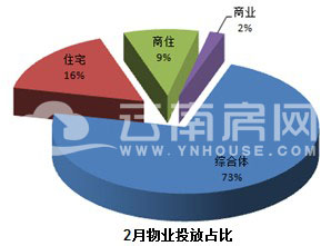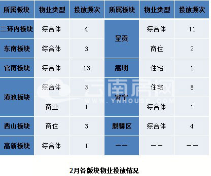 2月份物業(yè)投以綜合體物業(yè)投放最強(qiáng),主要集中官南板塊和呈貢區(qū)域;商業(yè)物業(yè)投放最弱,僅占比2%。