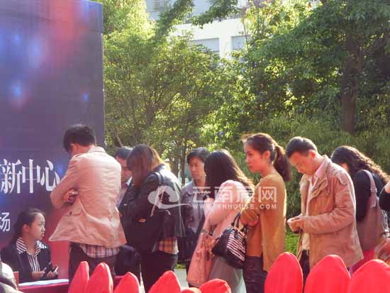 約9:15分,現(xiàn)場的主持人通知到場的客戶拿著集團認(rèn)籌卡到簽到區(qū)簽到,并領(lǐng)取購房序號牌,據(jù)主持人介紹,客戶簽到的順序?qū)⒊蔀樽罱K的選房順序。