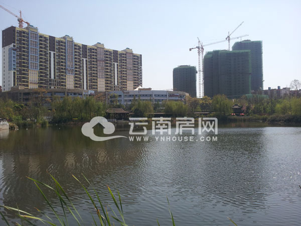蓮花池公園內(nèi)看項(xiàng)目,黃色的樓即為回遷房