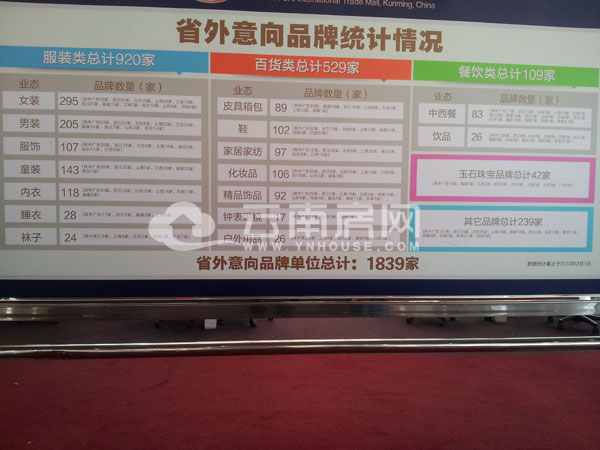 下午兩點(diǎn)半左右,云南房網(wǎng)踩盤組走進(jìn)了蓮花池國(guó)際商貿(mào)城的銷售中心,不過這個(gè)點(diǎn)蓮花池國(guó)際商貿(mào)城的銷售中心并不熱鬧,就連置業(yè)顧問也顯得懶洋洋的。一進(jìn)門我們就能看著大廳豎著這樣一塊展板,上面顯示的內(nèi)容為截止2013年2月1日該項(xiàng)目已經(jīng)達(dá)成入駐意向的省外商家數(shù)量,通過這個(gè)展板我們不難發(fā)現(xiàn),如今的蓮花國(guó)際商貿(mào)城的招商行業(yè)范圍涵蓋了男女服裝、童裝、內(nèi)衣及家居服裝、鞋襪、皮具箱包、家居家紡、化妝品、精品飾品、鐘表眼鏡、戶外用品、餐飲、玉石珠寶及其他?梢哉f,我們?nèi)粘I钪心軌蛳氲降摹⑿枰、想要的在未來的蓮花?guó)際商貿(mào)城都可以買到。以目前的省外合作意向數(shù)據(jù)1839家來看蓮花國(guó)際商貿(mào)城的商業(yè)體量,該項(xiàng)目未來將成為學(xué)府路片區(qū)的領(lǐng)軍之地。
