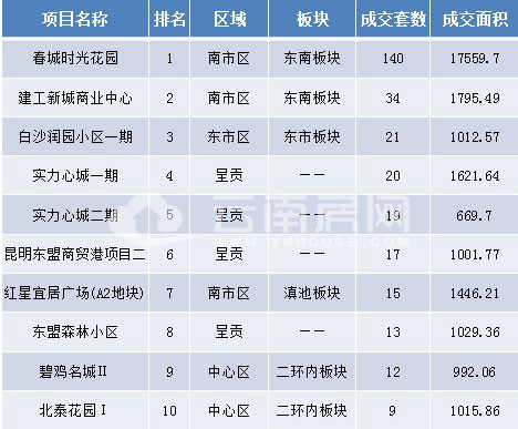 本周房地產(chǎn)市場交易套數(shù)三強:本周備案前三強分別位于南市區(qū)和東市區(qū),排名先后順序為:春城時光花園、建工新城商業(yè)中心與白沙潤園小區(qū)一期。注:由于備案系統(tǒng)異常,1、2號數(shù)據(jù)缺失,top10排名僅做參考。