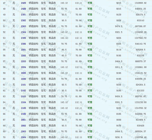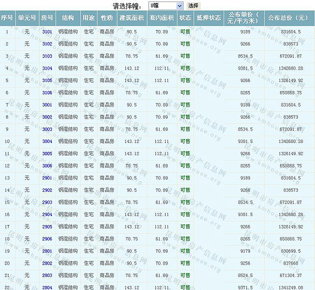 根據(jù)云南省物價(jià)局關(guān)于發(fā)布《云南省商品房銷售明碼標(biāo)價(jià)實(shí)施細(xì)則(試行)》的通知,現(xiàn)將該項(xiàng)目商品住房的準(zhǔn)售房源及每套房屋價(jià)格向社會(huì)公布,房地產(chǎn)開(kāi)發(fā)企業(yè)應(yīng)嚴(yán)格按照公布價(jià)格,商品房銷售明碼標(biāo)價(jià)實(shí)行一套一標(biāo)。商品房經(jīng)營(yíng)者應(yīng)當(dāng)對(duì)每套商品房按照建筑面具進(jìn)行明碼標(biāo)價(jià),否則,房產(chǎn)登記機(jī)關(guān)不予登記備案。準(zhǔn)售房源及房?jī)r(jià)信息如下: