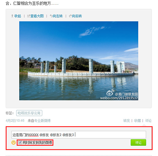 2:易門御景龍園官方微博每日上午9:30發(fā)布一條活動(dòng)微博,微博配圖為易門當(dāng)?shù)鼐包c(diǎn)照片,網(wǎng)友根據(jù)配圖在該條微博中競(jìng)猜圖片所示景點(diǎn)名稱,并轉(zhuǎn)發(fā)該微博@三位好友即為有效參與;