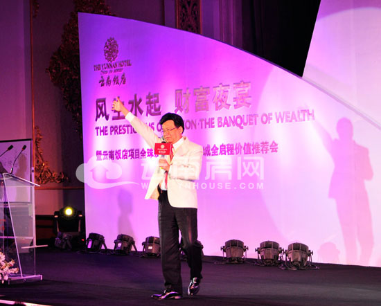 在云旅地產(chǎn)和龍宇地產(chǎn)兩大公司的常務(wù)副總經(jīng)理羅瑞珊和北京三英禾田機(jī)構(gòu)總經(jīng)理趙亮的致辭結(jié)束之后,全國(guó)知名的地理地貌學(xué)大師宋韶光“接管了”舞臺(tái)。他從生肖方面入手,為大家分析了生肖運(yùn)勢(shì)、家居風(fēng)水、辦公室風(fēng)水等問題,并從歷史學(xué)、地理學(xué)、地貌學(xué)、風(fēng)水學(xué)等風(fēng)水學(xué)的角度分析了他眼中的云南飯店和潤(rùn)城。