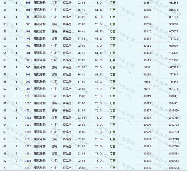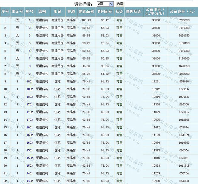根據(jù)云南省物價(jià)局關(guān)于發(fā)布《云南省商品房銷(xiāo)售明碼標(biāo)價(jià)實(shí)施細(xì)則(試行)》的通知,現(xiàn)將該項(xiàng)目商品住房的準(zhǔn)售房源及每套房屋價(jià)格向社會(huì)公布,房地產(chǎn)開(kāi)發(fā)企業(yè)應(yīng)嚴(yán)格按照公布價(jià)格,商品房銷(xiāo)售明碼標(biāo)價(jià)實(shí)行一套一標(biāo)。商品房經(jīng)營(yíng)者應(yīng)當(dāng)對(duì)每套商品房按照建筑面具進(jìn)行明碼標(biāo)價(jià),否則,房產(chǎn)登記機(jī)關(guān)不予登記備案。準(zhǔn)售房源及房?jī)r(jià)信息如下: