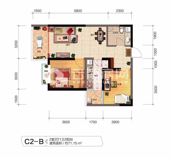 兩房兩廳一廚一衛(wèi)兩陽臺的C2-B戶型