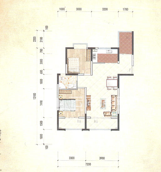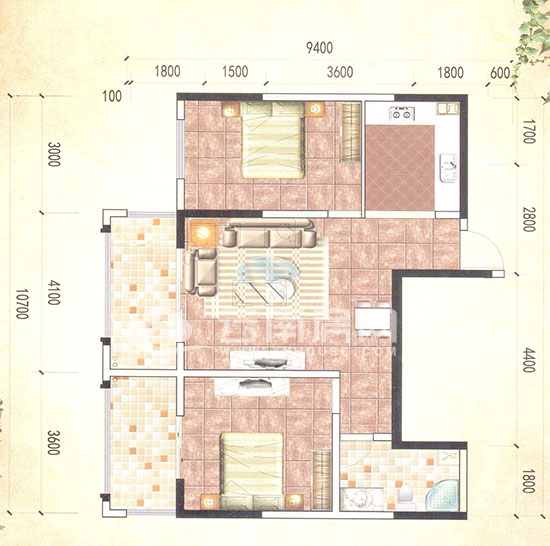 F戶型,建筑面積91.29平米,為兩室兩廳一廚一衛(wèi)雙陽臺設(shè)計。