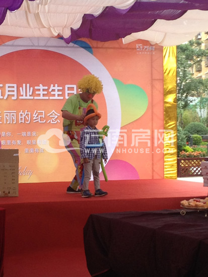 活動開始時,萬科金域國際售樓部聚集了五月生日的40多個家庭近百人,熱鬧無比。首先,小丑的吹氣球表演讓所有在場的小業(yè)主們high翻了天,什么小花朵呀、寶劍呀吸引的孩子們直接跑到了舞臺旁邊等著小丑哥哥制作好的玩具,還有一位小業(yè)主直接被小丑演員直接“武裝”了起來,全場的業(yè)主都被這溫馨、滑稽的瞬間感染。