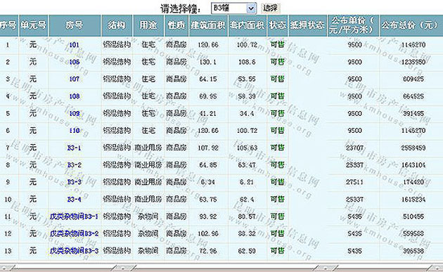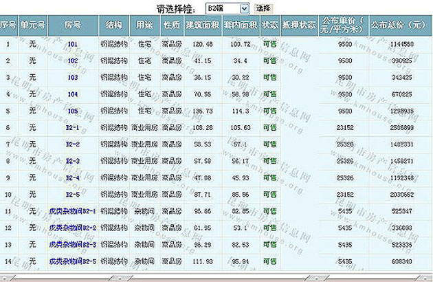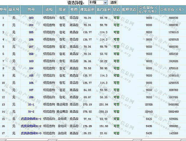 根據(jù)云南省物價(jià)局關(guān)于發(fā)布《云南省商品房銷售明碼標(biāo)價(jià)實(shí)施細(xì)則(試行)》的通知,現(xiàn)將該項(xiàng)目商品住房的準(zhǔn)售房源及每套房屋價(jià)格向社會(huì)公布,房地產(chǎn)開發(fā)企業(yè)應(yīng)嚴(yán)格按照公布價(jià)格,商品房銷售明碼標(biāo)價(jià)實(shí)行一套一標(biāo)。商品房經(jīng)營者應(yīng)當(dāng)對(duì)每套商品房按照建筑面具進(jìn)行明碼標(biāo)價(jià),否則,房產(chǎn)登記機(jī)關(guān)不予登記備案。準(zhǔn)售房源及房?jī)r(jià)信息如下: