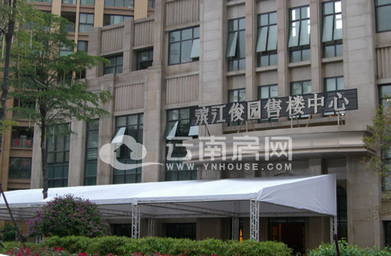 今日上午,小編遠(yuǎn)遠(yuǎn)的看見濱江俊園營銷中心門口的白色遮陽棚。
