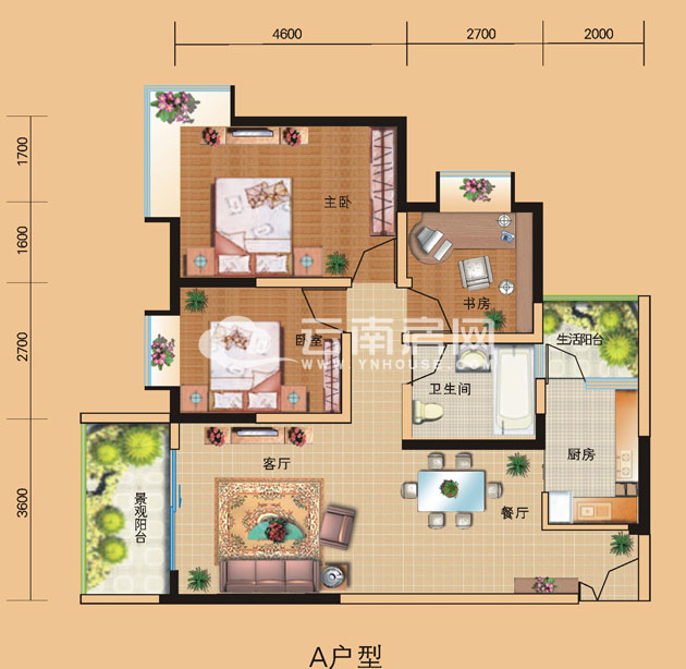 A戶型為3房2廳1廚1衛(wèi)2陽臺(tái),面積為90.17平米,戶型錯(cuò)落有致,主臥帶L型景觀飄窗,可暢享270度景觀視野,L形的流線設(shè)計(jì)便于廚房操作,廚房連接生活陽臺(tái),既利于排散油煙,還可作為儲(chǔ)物間增加廚房的使用面積,觀景大陽臺(tái)與客廳餐廳相連,寬敞大氣、采光、觀景效果俱佳,該戶型還設(shè)有書房,工作生活可隨心切換,該戶型適合三口之家居住,空間足夠,溫馨有余。