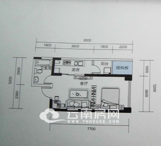進(jìn)入門廳之后便是客廳連接臥室的大通間,整個空間透過臥室大面寬窗戶采光,衛(wèi)生間安排與廚房一字型排開,干濕分離。廚房借用陽臺光線,通風(fēng)和采光都得到解決。整個戶型布局緊湊,利用率高。戶型缺憾是,房屋采光面少,灰色空間的存在在某些方面影響到生活便利。