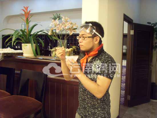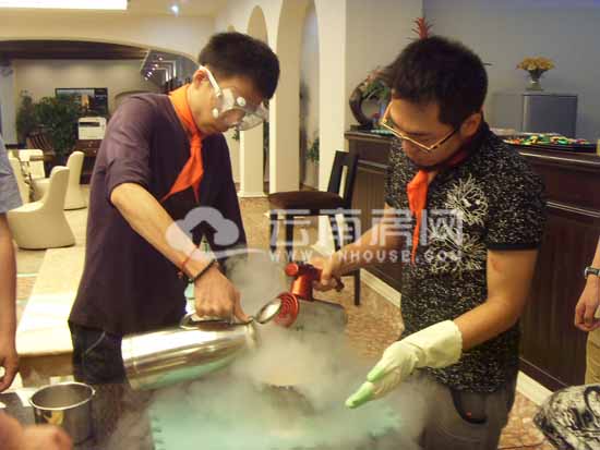 直到10分鐘后,工作人員才將成品呈現(xiàn)在大家面前——一大盒的香蕉冰淇淋,小編恍然大悟,原來(lái)今天這煙霧繚繞的活動(dòng)便是DIY冰淇淋大賽?吹匠善罚【幰曹S躍欲試,在現(xiàn)場(chǎng)工作人員的指導(dǎo)下,小編做了一份巧克力冰淇淋。其實(shí)原料都很簡(jiǎn)單,現(xiàn)成的巧克力基底液、奧利奧餅干一塊、普通純牛奶。首先把三種原料混合攪拌均勻,看著一大罐粘稠的液體,絲毫看不出冰淇淋的跡象。接下來(lái),最重要的原料就要登場(chǎng)了——液態(tài)氮,一名工作人員將液態(tài)氮倒入剛剛的混合液中,另一名工作人員還要負(fù)責(zé)扶著裝混合液的容器,小編就只負(fù)責(zé)打開(kāi)攪拌器拼命地?cái)嚢,頓時(shí)煙霧四溢,很有舞臺(tái)效果。