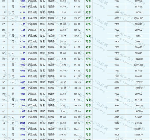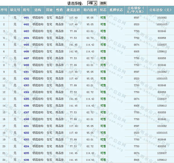 根據(jù)云南省物價局關(guān)于發(fā)布《云南省商品房銷售明碼標(biāo)價實(shí)施細(xì)則(試行)》的通知,現(xiàn)將該項(xiàng)目商品住房的準(zhǔn)售房源及每套房屋價格向社會公布,房地產(chǎn)開發(fā)企業(yè)應(yīng)嚴(yán)格按照公布價格,商品房銷售明碼標(biāo)價實(shí)行一套一標(biāo)。商品房經(jīng)營者應(yīng)當(dāng)對每套商品房按照建筑面具進(jìn)行明碼標(biāo)價,否則,房產(chǎn)登記機(jī)關(guān)不予登記備案。準(zhǔn)售房源及房價信息如下: