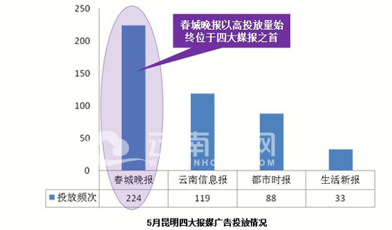 “春晚”首居:從5月昆明四大報(bào)媒投放情況來看,春城晚報(bào)的投放量始終保持領(lǐng)先位置,投放頻次為224次,占比48.28%;
