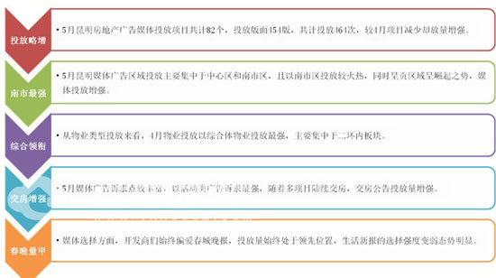 5月昆明房地產(chǎn)報(bào)媒廣告整體投放情況略有增強(qiáng)、中南集中、綜合物業(yè)主導(dǎo)、交房增強(qiáng)、春晚放量首居等特點(diǎn)