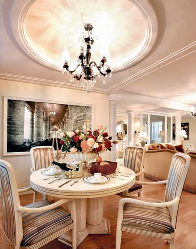 有些人覺得餐廳裝吊頂顯得氣派、漂亮。但是,現(xiàn)在的公寓層高通常只有2.6—2.8米,如果在這樣一個(gè)比較狹小的空間里再安裝一個(gè)吊頂在視覺上會(huì)使人感到緊張、壓抑,影響食欲。