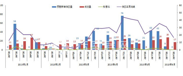 第23周市場(chǎng)新增供應(yīng)7.87萬(wàn)方,成交27.84萬(wàn)方,批售比為0.28;