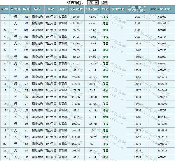 根據(jù)云南省物價(jià)局關(guān)于發(fā)布《云南省商品房銷售明碼標(biāo)價(jià)實(shí)施細(xì)則(試行)》的通知,現(xiàn)將該項(xiàng)目商品住房的準(zhǔn)售房源及每套房屋價(jià)格向社會(huì)公布,房地產(chǎn)開發(fā)企業(yè)應(yīng)嚴(yán)格按照公布價(jià)格,商品房銷售明碼標(biāo)價(jià)實(shí)行一套一標(biāo)。商品房經(jīng)營(yíng)者應(yīng)當(dāng)對(duì)每套商品房按照建筑面具進(jìn)行明碼標(biāo)價(jià),否則,房產(chǎn)登記機(jī)關(guān)不予登記備案。準(zhǔn)售房源及房?jī)r(jià)信息如下:
