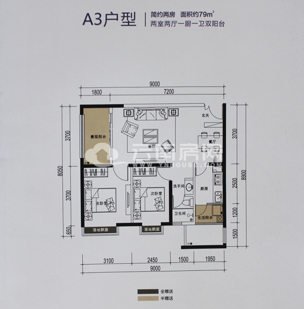 A3戶型,79平米兩室兩廳一廚一衛(wèi)雙陽臺簡約戶型。該戶型贈送5平米,是目前項目推出的最小戶型,主次臥均為落地凸窗,戶型和A1一樣都較為方正,客廳旁為景觀陽臺,整個客廳通透明亮,陽光充足。不足之處:主臥的門與客廳相對,私密性不是很好,其次主臥離衛(wèi)生間較遠,洗手間和廚房餐廳較近,觀景陽臺過于浪費空間?傮w來講,相對于79平米的小戶型來說,整個戶型的空間還是得到了較充分的利用,稍顯不足之處就是戶型分布略顯不合理。