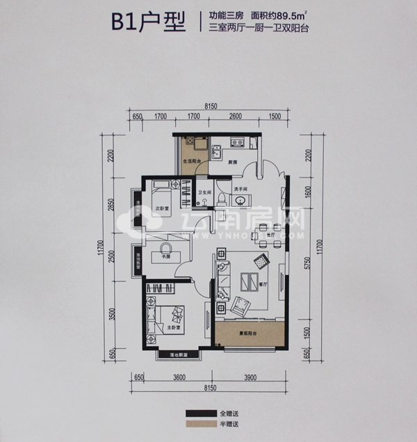 B1戶型,89.5平米三室兩廳一廚一衛(wèi)雙陽臺功能三房戶型。該戶型贈送6平米,主臥為南向配落地凸窗,朝向較好,客廳的景觀陽臺可隨心變動,增大客廳面積,整個空間開闊,通道少,減少浪費面積,此戶型主臥、次臥、客廳、書房、廚房、衛(wèi)生間等均有窗戶,通風較好。不足之處:此戶型和A3戶型一樣,廚房和衛(wèi)生間、餐廳距離較近,并且開門即為衛(wèi)生間,顯得不雅,不過對于業(yè)主來說,這個戶型可以根據(jù)需求把書房改為臥室,成為緊湊型的三居室。