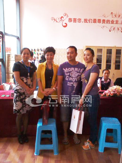 沈總裁(中)與第一對成功交房的小夫妻合影(右)