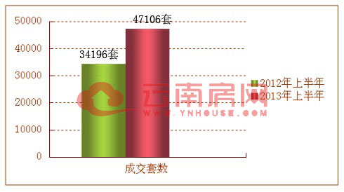 根據(jù)昆明市房產(chǎn)信息網(wǎng)數(shù)據(jù)統(tǒng)計顯示,2013年一到六月,昆明主城四區(qū)及呈貢新區(qū)共成交各類商品房47106套,與2012年一到六月成交34196套相比,增加了12910套,同比上漲37.74%,平均每個月的成交為7851套;成交面積為4169255.8㎡,與2012年上半年成交2531925.52㎡相比,增加了1637330.28㎡,同比上漲64.67%,平均每月成交面積為694875.97㎡。通過數(shù)據(jù)可以看出,2013年上半年昆明樓市成交套數(shù)及成交面積都較2012年上半年有大幅上漲。