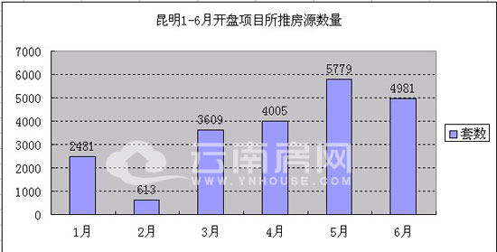 綜合1-6月昆明樓市開(kāi)盤(pán)的情況來(lái)看,除了2月份因過(guò)年長(zhǎng)假影響而推盤(pán)量較小之外,其余各月推盤(pán)量均在3000套以上,其中,5月份推盤(pán)量最多,19項(xiàng)目共推出各種物業(yè)類(lèi)型5779套。據(jù)云南房網(wǎng)統(tǒng)計(jì),1月昆明市開(kāi)盤(pán)項(xiàng)目共推出房源2481套,2月推盤(pán)量最小為613套,至3月開(kāi)盤(pán)項(xiàng)目推出的房源數(shù)量大幅度回升,為3609套。4月推盤(pán)量繼續(xù)增加,13項(xiàng)目共推房源4005套,而6月就推盤(pán)量而言,較5月又有小幅下滑,14項(xiàng)目共推房源4981套。