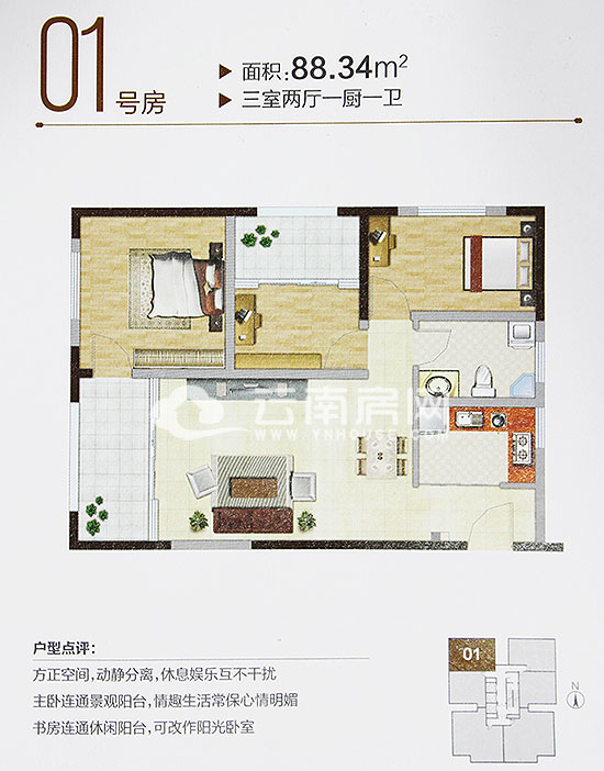 01號房,建筑面積88.34平米,三室兩廳一廚一衛(wèi)設(shè)計。