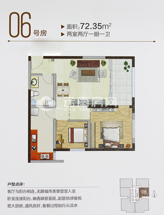 06號房,建筑面積72.35平米,兩室兩廳一廚一衛(wèi)設(shè)計。