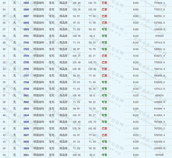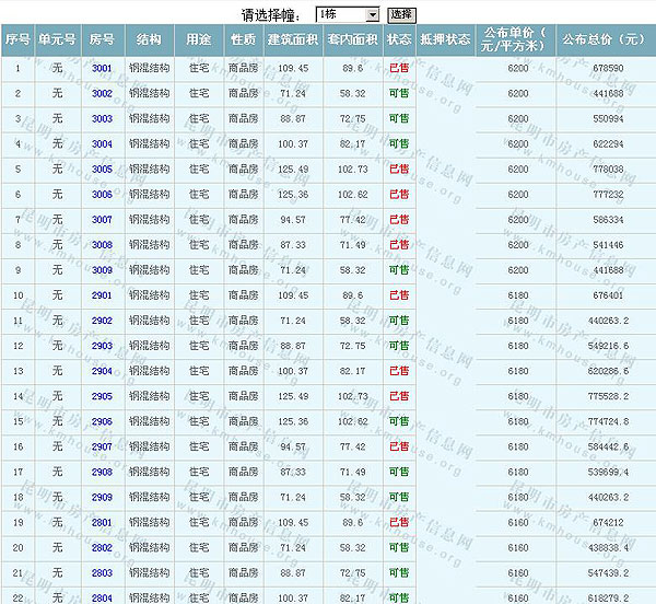 根據(jù)云南省物價局關(guān)于發(fā)布《云南省商品房銷售明碼標(biāo)價實施細則(試行)》的通知,現(xiàn)將該項目商品住房的準(zhǔn)售房源及每套房屋價格向社會公布,房地產(chǎn)開發(fā)企業(yè)應(yīng)嚴(yán)格按照公布價格,商品房銷售明碼標(biāo)價實行一套一標(biāo)。商品房經(jīng)營者應(yīng)當(dāng)對每套商品房按照建筑面具進行明碼標(biāo)價,否則,房產(chǎn)登記機關(guān)不予登記備案。準(zhǔn)售房源及房價信息如下:
